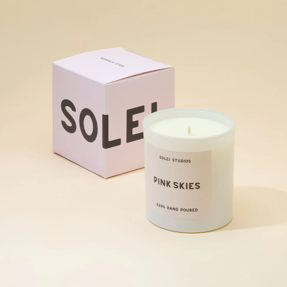Immerse yourself in the art of scent with Solei Studios' large handmade candles. Each candle is crafted to transport you to a specific sensory experience, whether it's the warmth of a setting sun (Sundown), the tranquillity of a floral escape (Pink Skies), or the invigorating freshness of the coast (Beach Walk). Made with care, these candles offer a long-lasting burn and a beautiful ambiance for your home.